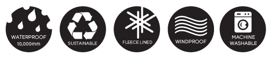Outer: 10,000mm Waterproof & Windproof 100% Recycled rPET Tricot Shell with bonded 100% Recycled rPET Microfleece lining