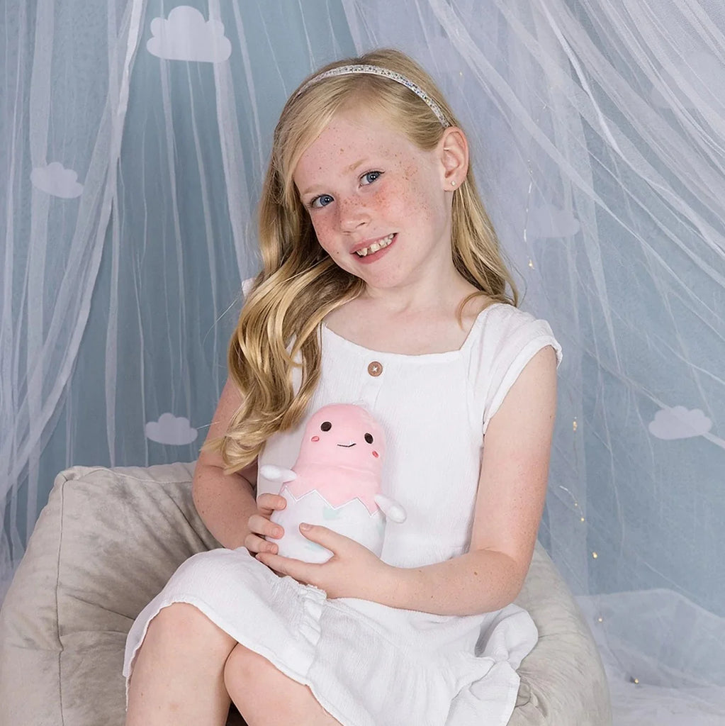 Fear of the dark is extremely common for young kids and can often cause sleepless nights and difficulty transitioning to their “big kid beds.” This is where Adora's Snuggle and Glow collection of snuggle buddies can help. Offering a warm and reassuring glow to assist with sleep training, this reversible pink Snuggle and Glow Dino stuffed animal will help your child feel secure and happy all night long.