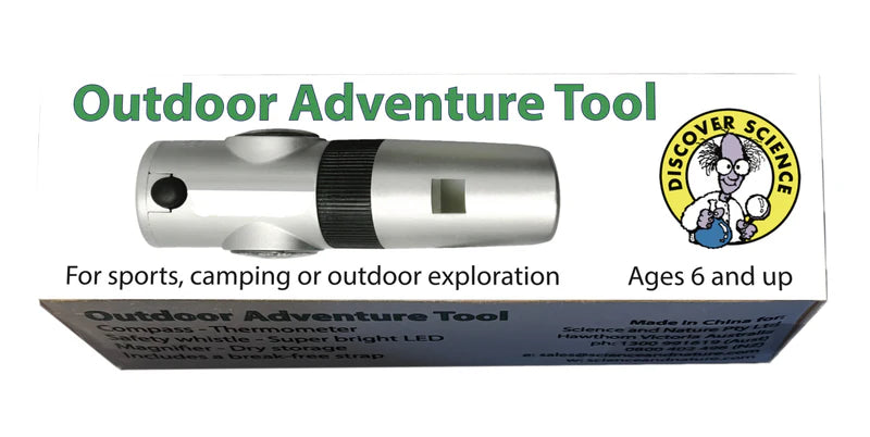 This compact adventure tool has 7 devices packed into one small, sleek device! Super-bright LED flashlight, Whistle Compass, Thermometer, Detachable magnifying glass and hidden storage compartment.