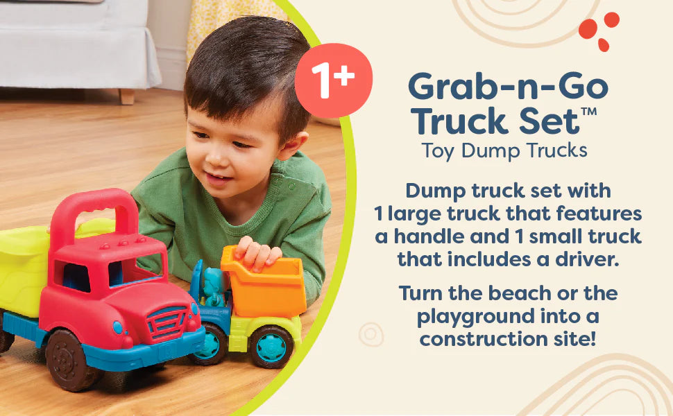 Dump and roll, in the sand or on the floor with the Dump Truck Duo from B. play! Fill these toy trucks with tons of fun and turn any place into a building site. Toddlers can easily transport rocks, sand, water, and debris, or even take a few of their plushy pals for a ride. Both trucks have moveable parts and wheels that roll smooooothly across any surface. As kids play at home, in the sandbox, at the playground, or at the beach, they will also develop their fine motor skills and hand-eye coordination. And because we at B. keep the environment in mind, parents will be happy to know that our packaging was made using responsibly sourced materials. Recommended for children 18 months and over.