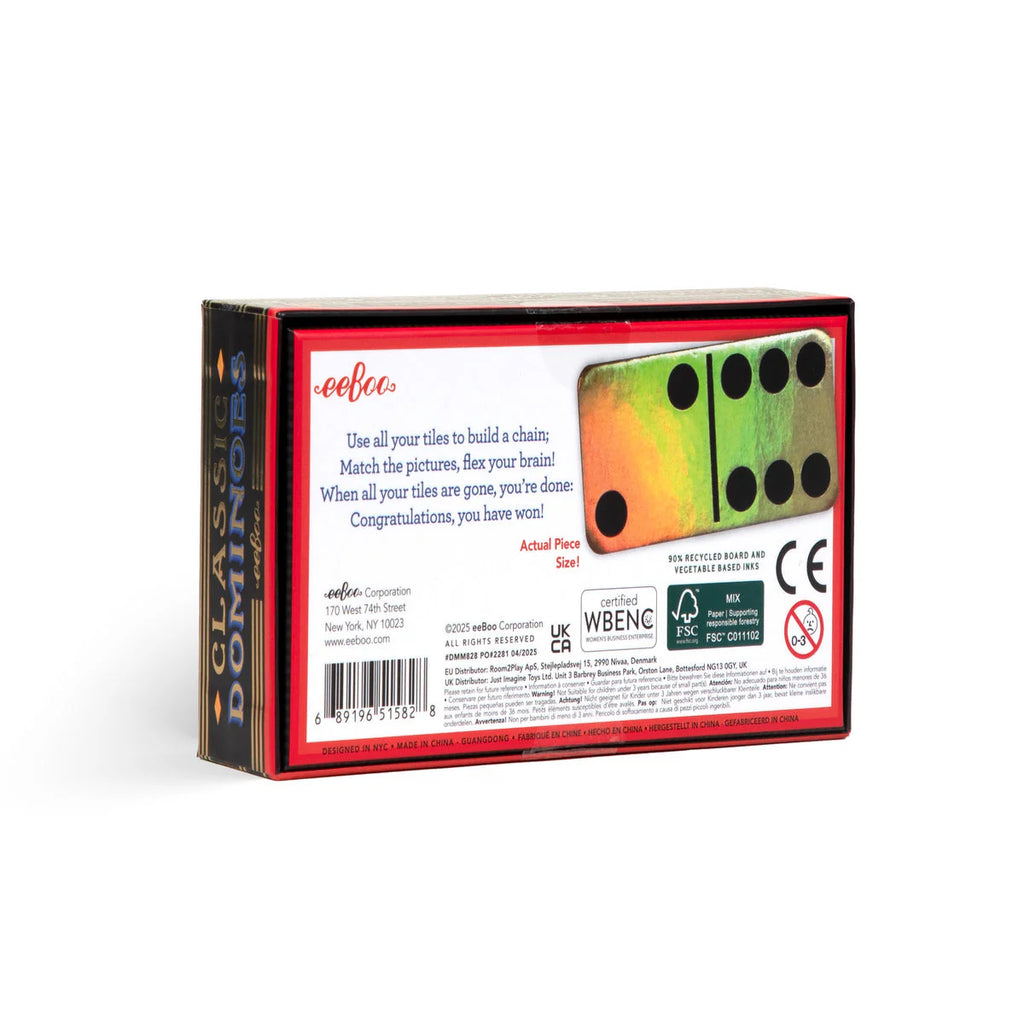 This bold, shiny take on a beloved classic offers a beautiful introduction to the game of dominoes. Each dazzling domino piece features two pip panels with golden, holographic foil. The set includes classic-sized pieces—perfect for players young and old. A game and gift the whole family can enjoy.