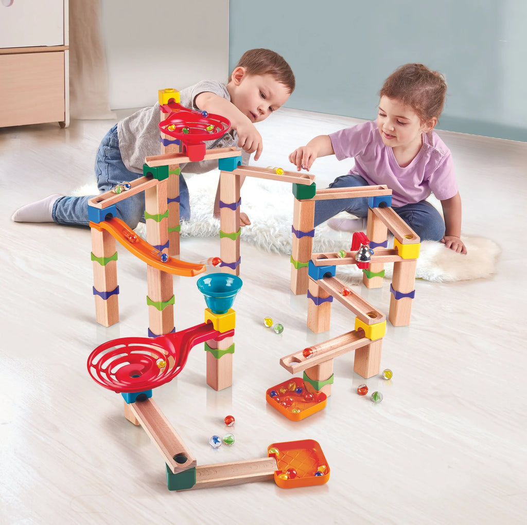 Hape Marble Cascade Block Set combines open-ended construction with physics-based play. Children stack and arrange wooden blocks to create custom marble runs, developing spatial reasoning and problem-solving skills. The cascading marble action provides immediate visual feedback, reinforcing cause-and-effect learning. Durable hardwood construction withstands repeated play, while the modular design encourages creative experimentation and extended engagement across multiple age groups.Hape Marble Cascade Block Set