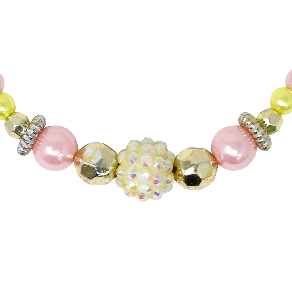 The Lemon Delight Necklace & Bracelet Set is fresh and vibrant with an assortment of pink and lemon pearls with accents of metallic gold. It features a gem-encrusted central bead with sparkles from every angle.