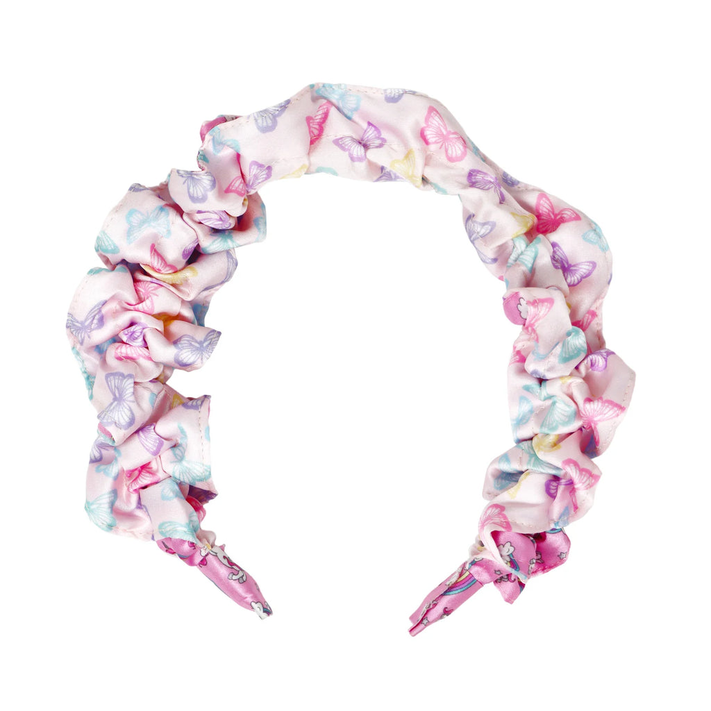 Pink Poppy's Reversible Ruffle Headband offers a unique twist with its reversible design. With dreamy unicorns on one side and fluttering butterflies on the other, this functional and fashionable hair accessory is the perfect way to complement any style.