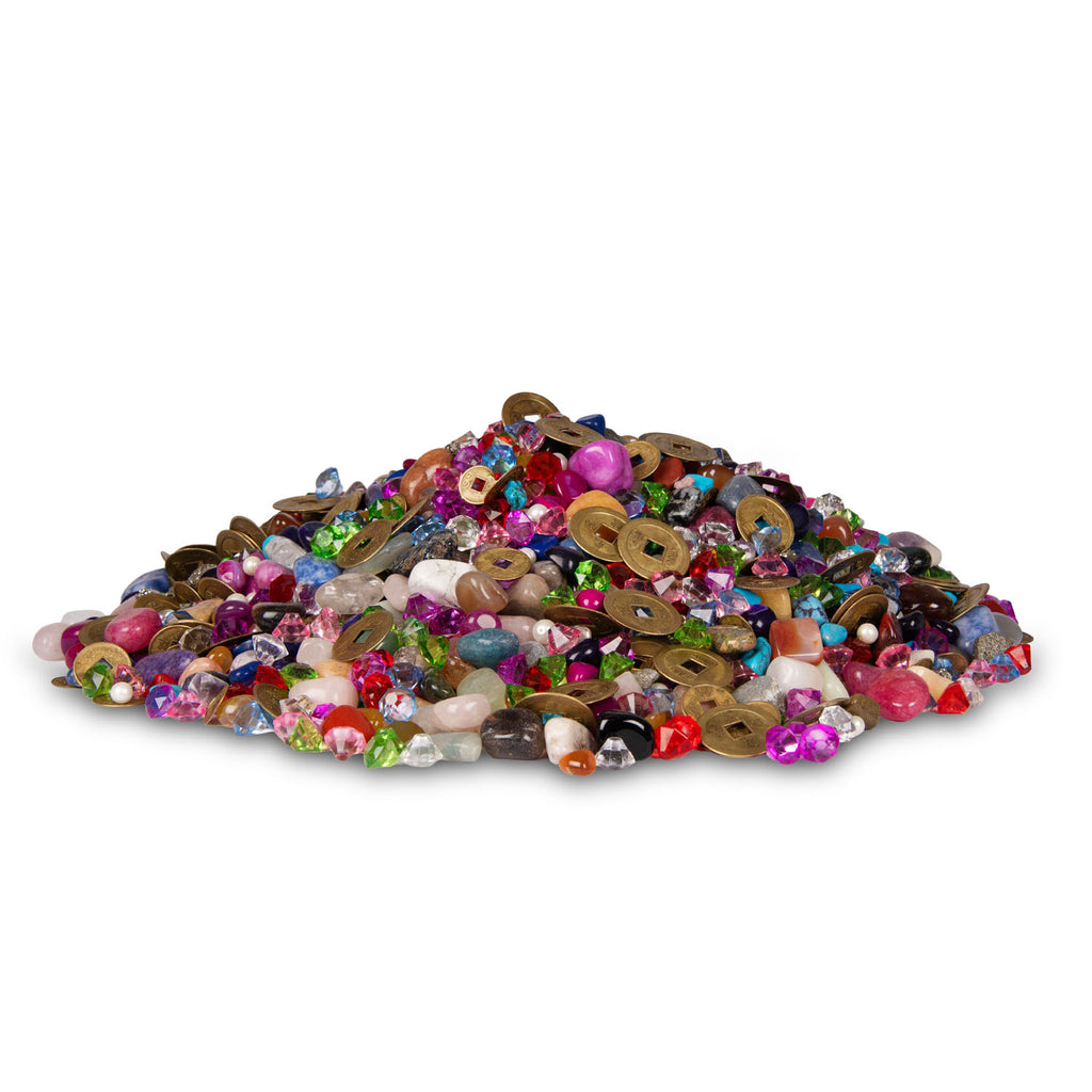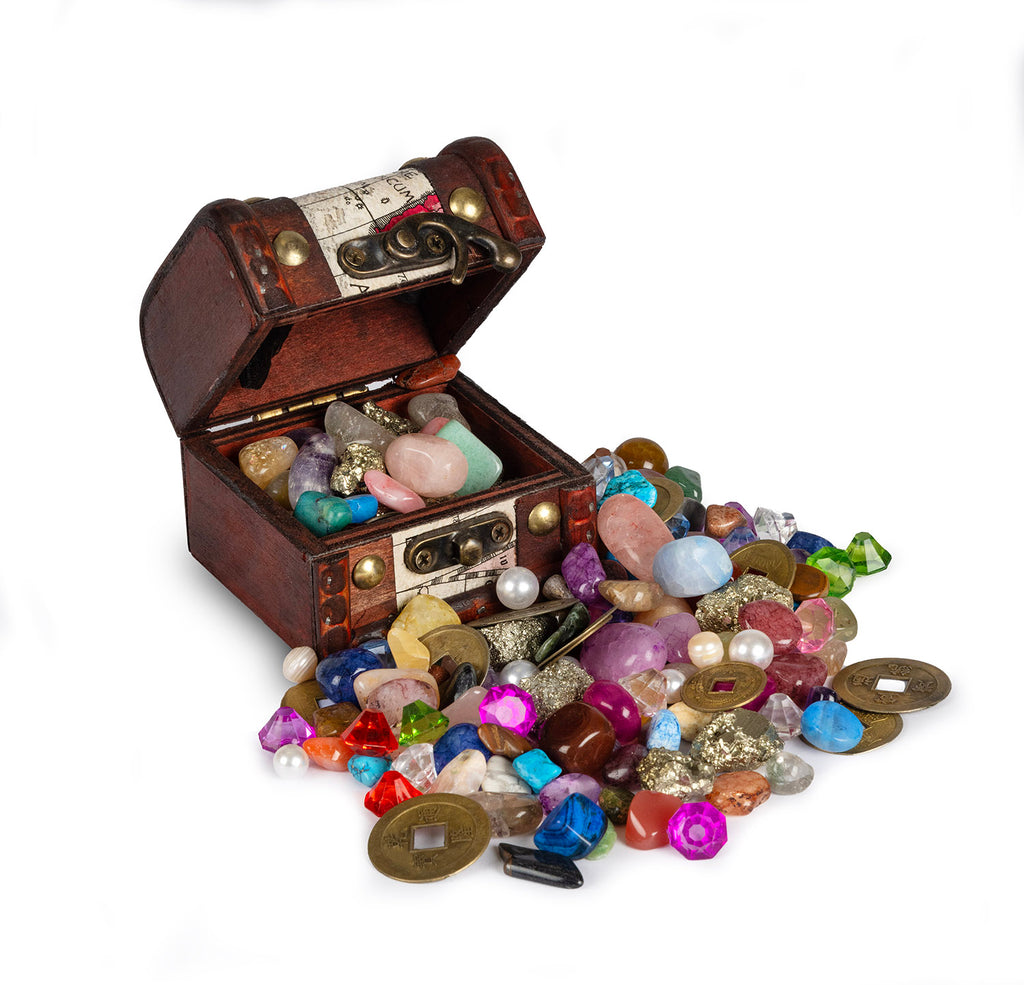 These decorative chests, part of our range of novelty packs, contain small, sparkling, colorful pieces of cracked quartz, agate, and polished gems, along with fool’s gold, imitation crystals, ‘ancient coins,’ real and faux pearls, and turqurenite nuggets.