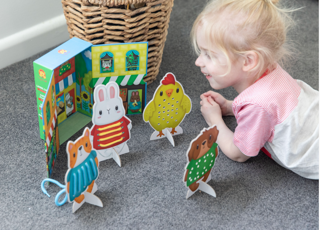 4 x animal character lacing cards 4 x cardboard stands 4 x coloured laces (100cm long) handy storage box that converts to a backdrop play scene